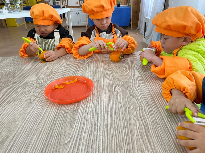 小朋友们饶有兴致地完成着晒柿饼的每一步,