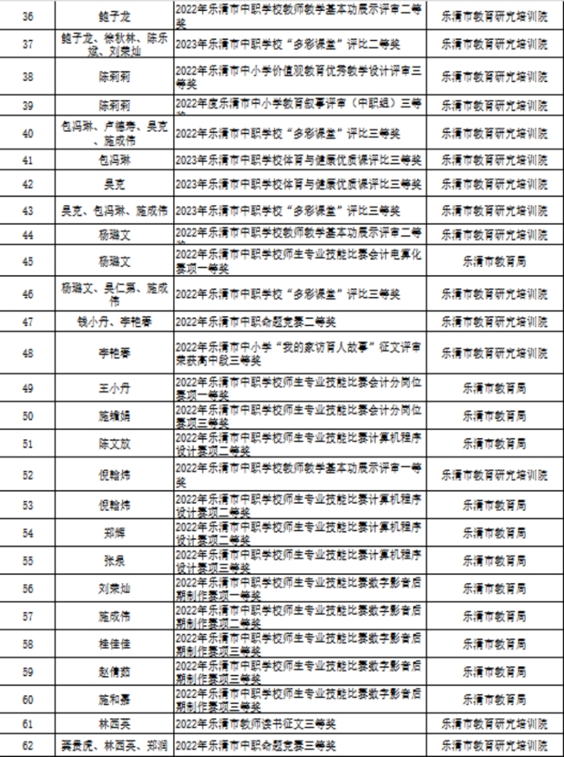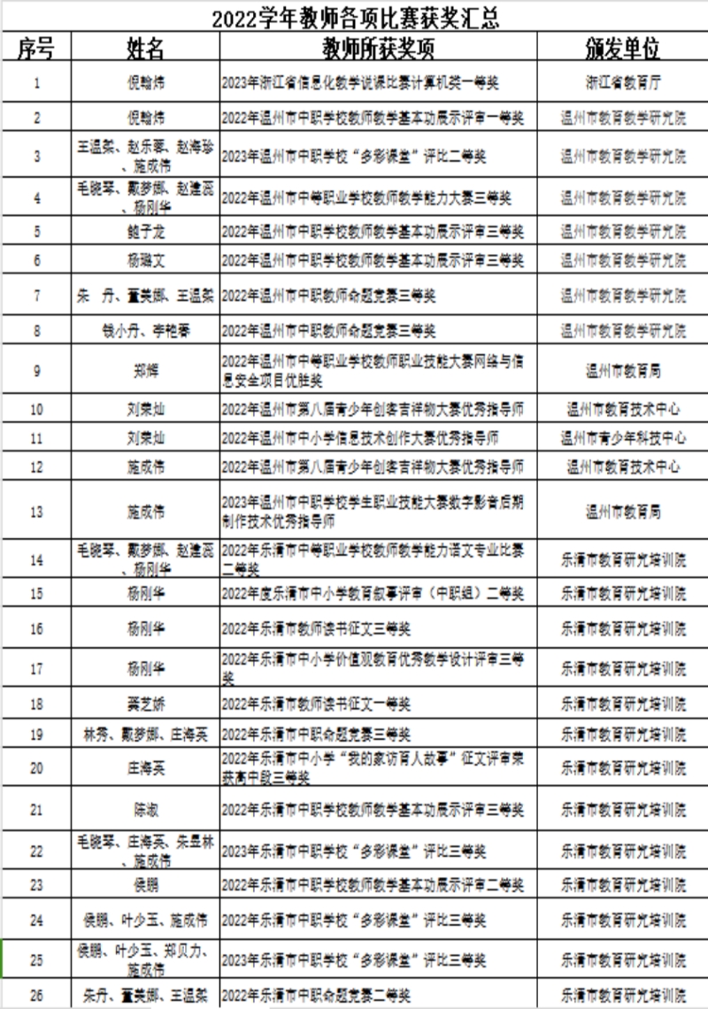 只有不断深化教育教学改革,提高人才培养质量,才能更好地满足社会对技能型人才的需求。2023年,学校贯彻落实《关于推动现代职业教育高质量发展的意见》《职业教育提质培优行动计划(2020-2023 年)》文件要求,以创新发展高地“活力温台”建设为机遇,深化中职“三教改革”,完善学校专业课程,按照专业设置与产业需求对接、课程内容与职业标准对接、教学过程与生产过程对接的要求,及时更新教学标准,将新技术、新规范及时纳入教学内容。2022学年学校积极发动教师参加省市县级别的教学能力大赛、班主任能力大赛、信息化教学大赛及职业能力大赛等,以赛带练、以赛促学、以赛促教,以赛促改。今年6月份,学校倪翰伟老师在2023年浙江省中等职业学校文化课、专业课教师信息化教学设计和说课大赛中,以优异的成绩获得了省赛一等奖。其参赛作品入选全国中等职业学校工科类教师教学设计典型示范案例,将由高等教育出版社出版,向全国推广。学校教师参加各类教学技能比赛获得奖项70余项(见下表)。注重学生技能培养,学生参加各级各类技能比赛、面向人人大赛,学生技能水平大幅提升。