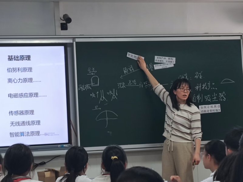 乐清市公立寄宿学校陈露燕老师带来八年级科学课例《自制吸尘器》。她以“如何让灰尘自动跑到塑料瓶里”为驱动问题,引导学生通过实验探究“流速与压强的关系”,结合伯努利原理设计制作吸尘器。整个课堂融合科学探究、安全教育与工程实践,学生动手操作中感悟“基本原理”与“现象好奇”对科技创新的意义。