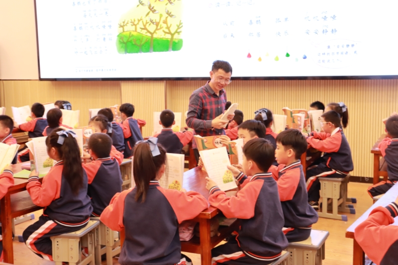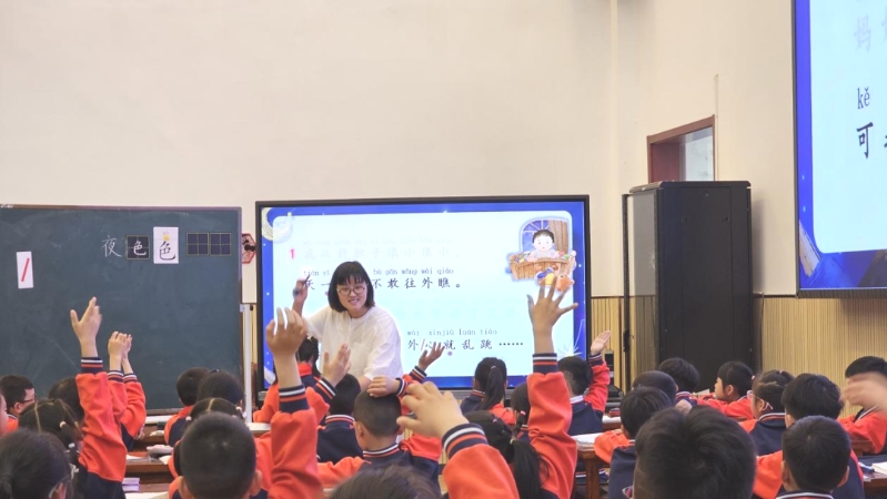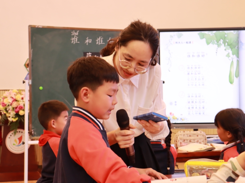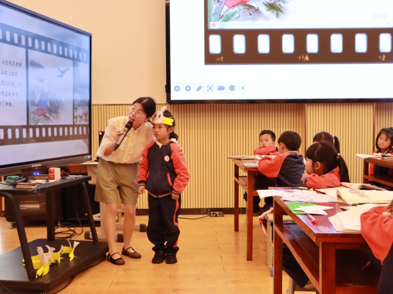 乐清市雁荡镇第一小学陈雪燕老师教学“和大人一起读”板块中的《谁和谁好》,通过创设“会说话的诗歌墙”这一情境,借助“时光留声机”激发学生阅读、创编的兴趣,悄然在孩子们心田播下了诗意表达的种子。乐清市建设路小学周佩青老师在《要下雨了》一课中,采用动画配音和角色扮演的形式,将识字教学与语言训练有机结合,既夯实识字基础,又提升语言表达能力。
