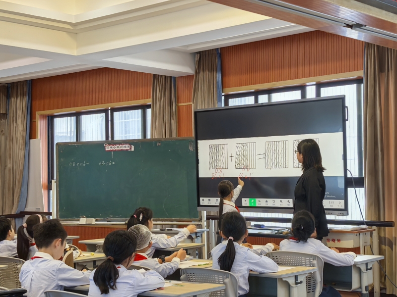 李老师先是通过红包问题引入小数加减法,引导学生用单位换算、数形结合等方式探索0.8+0.6的计算。李老师的课堂采用探究式学习,学生在正方形分割、竖式对比的过程中发现“相同计数单位相加”的规律以及小数点对齐的好处,进而获得小数竖式计算的格式规范。紧接着,李老师让学生从小数加法计算正向迁移至小数减法的学习,让学生在尝试之后总结小数加减法的计算方法和注意事项。在后续的练习中,李老师紧紧抓住数位对齐的要点,帮助学生进一步理解相同计数单位相加减的算理,纠正常见错误,巩固本节课的知识要点。