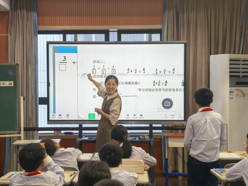 本节课陈老师引导学生通过图文结合的方式思考八分之三与八分之一和的计算,学生在不断的对比中发现无论是图还是线段或是文字都在说明八分之三+八分之一就是在算3个八分之一+1个八分之一。由此得出同分母分数加减法中,分数单位相同,计算时可以把分子直接相加减。陈老师在分数加减法学习后,还类比到了整数、小数加减法,加深了学生对计数单位一致是运算关键这一知识点的理解和记忆。最后陈老师让学生思考1减分数中1为什么要变成八分之八,这不但巩固了本节课计数单位统一的重要性也为后续异分母分数的学习做下铺垫。