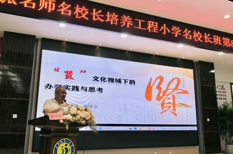 交流会上,徐顺辽书记率先登台,以《“贤”文化视域下的办学实践与思考》为题,分享了学校在“贤”文化引领下的办学探索之路。徐书记指出“贤”文化是中华优秀传统文化的重要组成部分,将其融入办学实践,既是对文化的传承,更是对育人本质的回归。