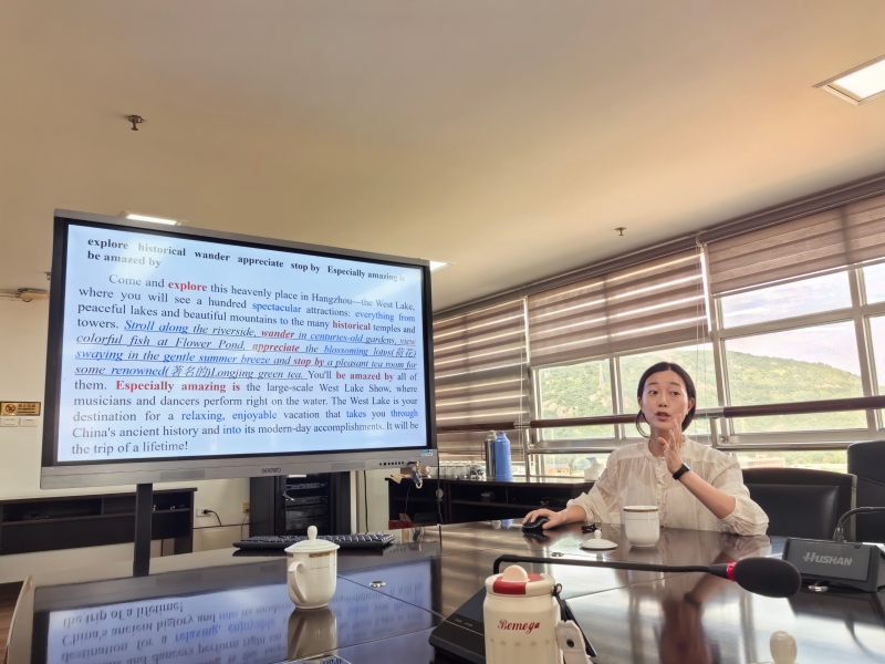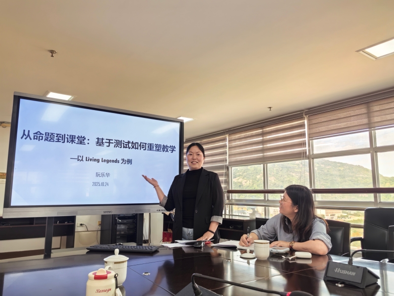 乐清大荆中学阮乐华老师带来了《从命题到课堂:基于测试如何重塑教学——以Living Legends为例》。她先以高考评价体系的“一核四层四翼”为锚点,提出“育人导向——基础夯实——思维跃迁”三维目标;再以Living Legends课堂实录为蓝本,拆解“明文体——注结构——习修辞——学品质”四步路径,把“命题语言”无痕转化为“教学语言”,让“能力、思维、价值”在课堂上同频共振。