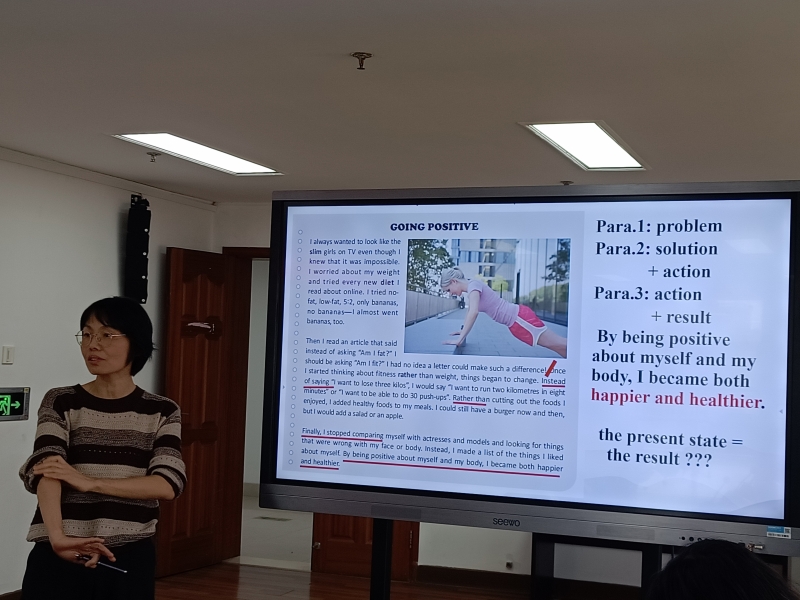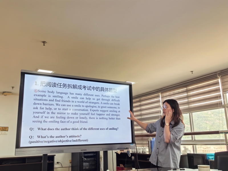 随后,乐清中学陈路平老师以《测试视角下的阅读设计》为题,分享了“把课堂阅读任务拆解为考试题型”的操作路径:画思维导图、抓同义转换、叮“转折后重点”,更把“跨文化理解+批判性思维”写进每一节家常课。一“读”发言回应了前一个发言的一“写”,准确回应了教师课堂教学的难点与增长点。