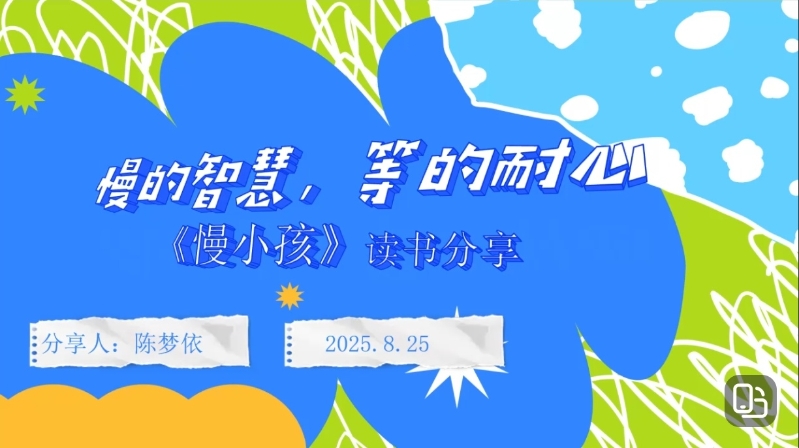 陈梦依老师则用温柔的声音,将大家带入《慢小孩》的诗意世界。她分享了书中乌龟老师、树懒学生构成的“教育乌托邦”,那里崇尚“等待哲学”,守护每个孩子的差异成长。通过对“慢慢”和“呱呱”两个角色的剖析,她引导大家反思:教育是“把灯点亮”,而非“把篮子装满”。孩子的“慢”可能是深度学习的发生,也可能是情感需求的信号。陈老师倡议,在日常教学中,把催促的“快点”换成支持的“需要我帮忙吗?”,用“蜗牛勋章”肯定过程而非结果,做童年的守夜人,静听生命拔节的美妙声音。