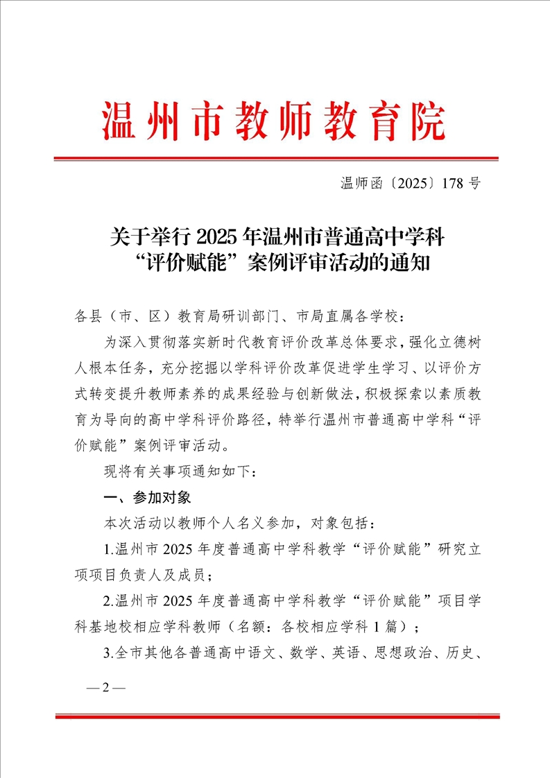 关于转发《关于举行2025年温州市普通高中学科“评价赋能”案例评审活动的通知》的通知