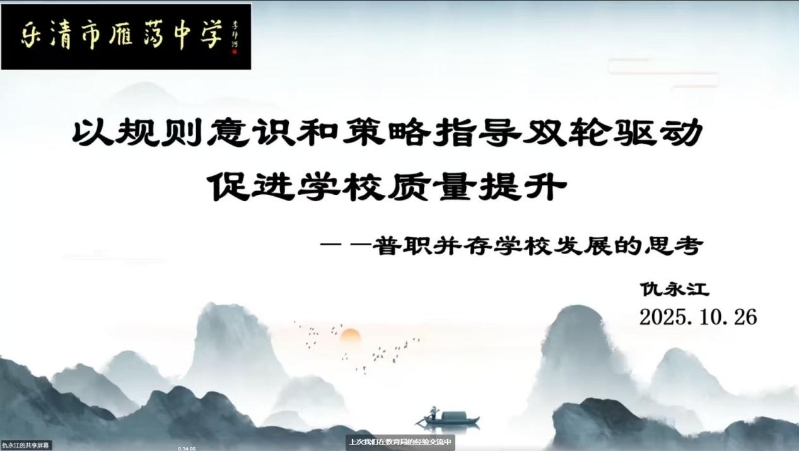 雁荡中学书记、校长仇永江结合学校“普职并存”的现实挑战,以“规则意识”和“策略指导”双轮驱动促进学校质量提升为题进行分享。一方面客观分析了学生在学习意识、能力和目的上存在的显著落差,强调要面向所有学生,培养学生“遵纪守法、遵守校纪、会学习”的品质;一方面突出策略指导,使教师教学更有方向,不断提升德育和教科研水平,扎实推动学校教学质量的提升。