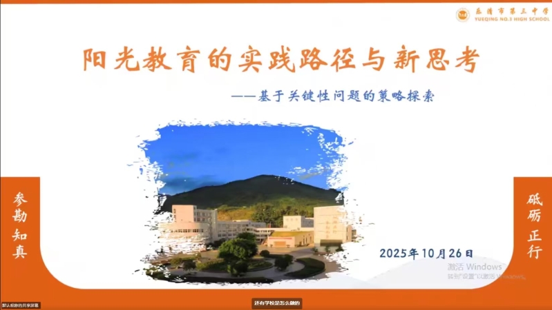 乐清市第三中学总支委员、副校长王昆基于三中振兴进程中的关键性问题,做了“阳光教育的实践路径与新思考”主题分享。他系统梳理了学校在提升过程中面临的四大挑战:竞争压力、师资结构失衡、特殊生(如带手机、心理问题)处理困难以及办学资源受限。并分享了学校推进精准分层教学、精细化管理(“352五星课堂”)、优化食堂管理以及人才梯队建设等具体应对策略。