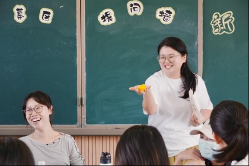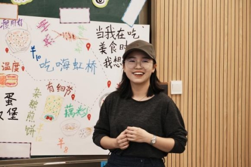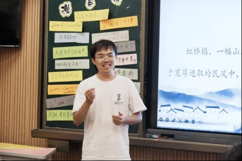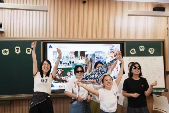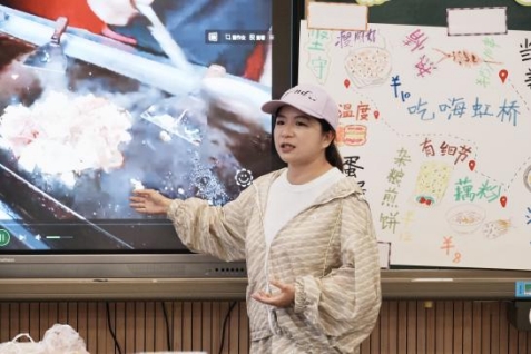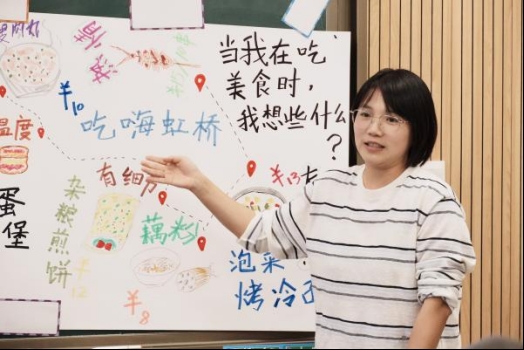 当三组成员带着满满的“战果”返回,教室变身成热闹的“跨界秀场”:第一组带来《虹桥人文印象志》,一张张精心挑选的照片搭配生动讲解,从虹桥的历史由来讲到如今的社会变迁,从独特的风俗特点说到居民的日常生活,一个个鲜活的虹桥故事让在场者直呼“原来身边藏着这么多精彩”;第二组以“穿搭直播间”为创意情境,成员们现场创意变装,结合教学、会议、运动会等不同场景,分享实用的教师穿搭公式,推荐的高性价比单品更是被大家纷纷“种草”;第三组则手绘出色彩鲜艳的“虹桥美食地图”,不仅标注出“鸡蛋灌饼”“烤冷面”“瘦肉丸”等街头美食的热门摊位,更分享了美食背后摊主与顾客的温情小事,让味蕾记忆与情感共鸣撞了个满怀。