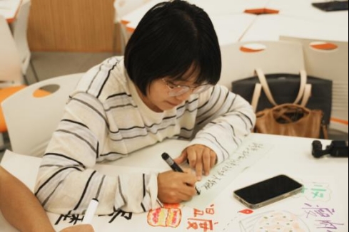 展示过程中,教室裡笑声、掌声、快门声此起彼伏,更有创意十足的“手写弹幕”环节——大家把点赞、感悟写在词纸上,贴满整面“弹幕墙”,让思想在互动中碰撞出更多火花。