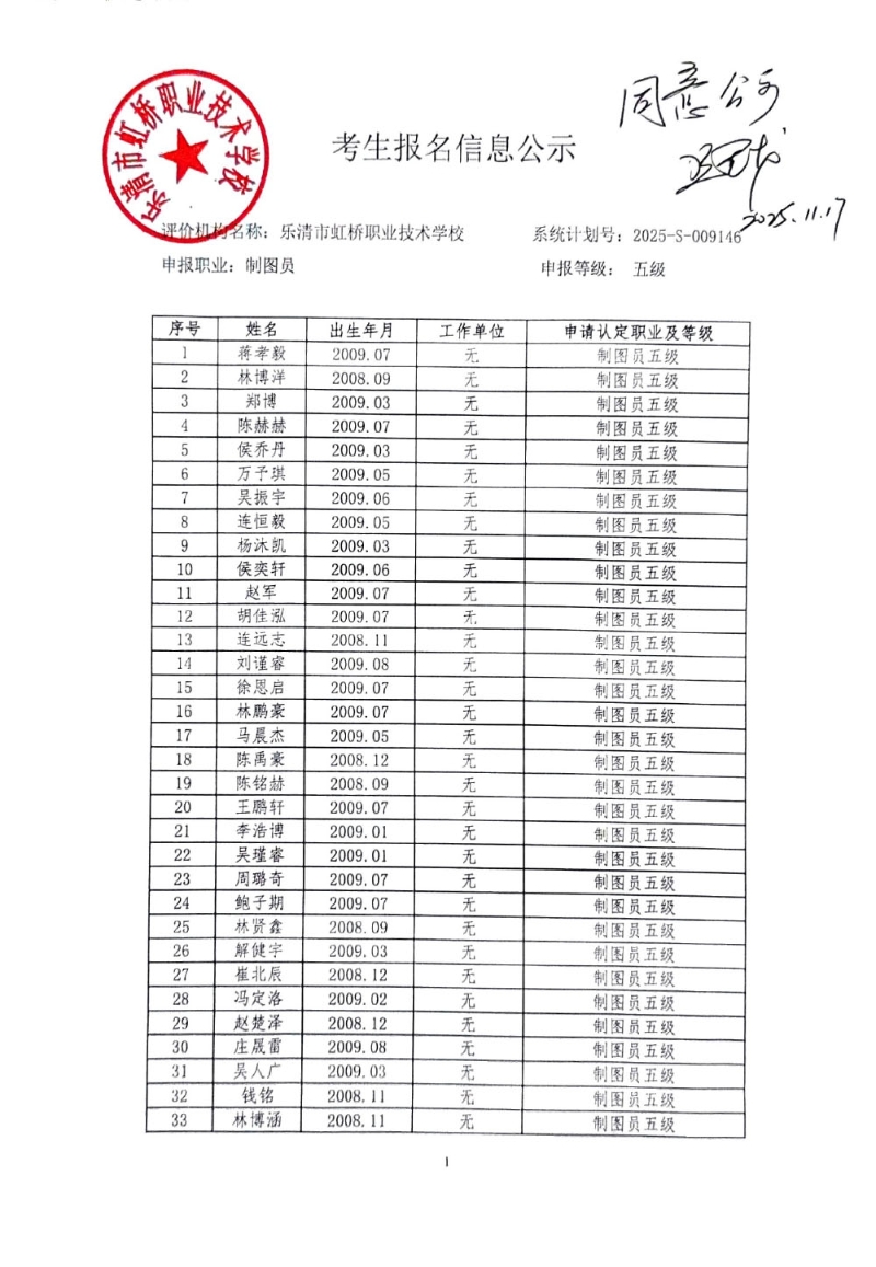 乐清市虹桥职业技术学校11月份制图员初级考生报名信息公示