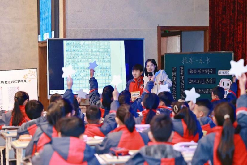 平阳县教坛新秀张茜茹老师展示五上第八单元习作指导《推荐一本书》第二课时。课堂围绕学生习作修改与好书推荐展开,张老师引导学生通过分析范例、对比AI建议与同学修改意见,提升写作中的表达力与感染力。张老师还重点强调在推荐书籍时需结构清晰、举例具体、融入个人感受,并运用互动性语言激发读者兴趣。同时提醒学生合理使用AI工具,保持独立思考能力。张老师在课堂尾声组织学生分享修改成果,通过小组互评和推荐官徽章激励机制,增强学生的参与感与成就感。