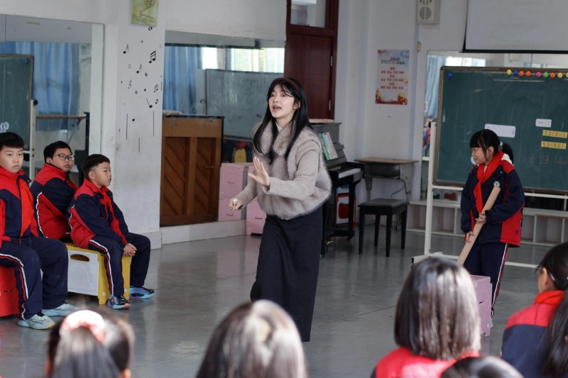 下午第二节课由黄凌晨老师在四(4)班执教。课堂伊始,黄老师以丰富的趣味活动开启教学:带领学生听双响筒定恒拍、唱音阶上下行,又以“大家来劳动”的互动环节引导学生随乐模仿劳动动作,还结合节奏练习、身体拍击体验二拍子的强弱规律,一系列沉浸式的热身活动,迅速让学生融入音乐情境,充分调动了学生的听觉、动觉与参与热情。新课教学环节,黄老师紧扣《舂米歌》的劳动主题与音乐特点展开教学。她边唱边与学生合作打拍,通过师生对拍、听唱感知歌曲内容,引导学生用动作表现“舂米、筛米”的劳动场景;随后开展分组演唱、师生合作、旋律接唱等活动,逐步引导学生完整演唱歌曲,并借助乐谱分析发现旋律重复特点,让学生在唱、演、思中理解歌曲结构。为深化体验,黄老师还组织学生分“舂米组”“筛米组”“演唱组”分别体验,让学生在角色扮演与合作表演中,将劳动动作与歌曲演唱相融合,充分感受民间音乐与劳动生活的紧密联系。