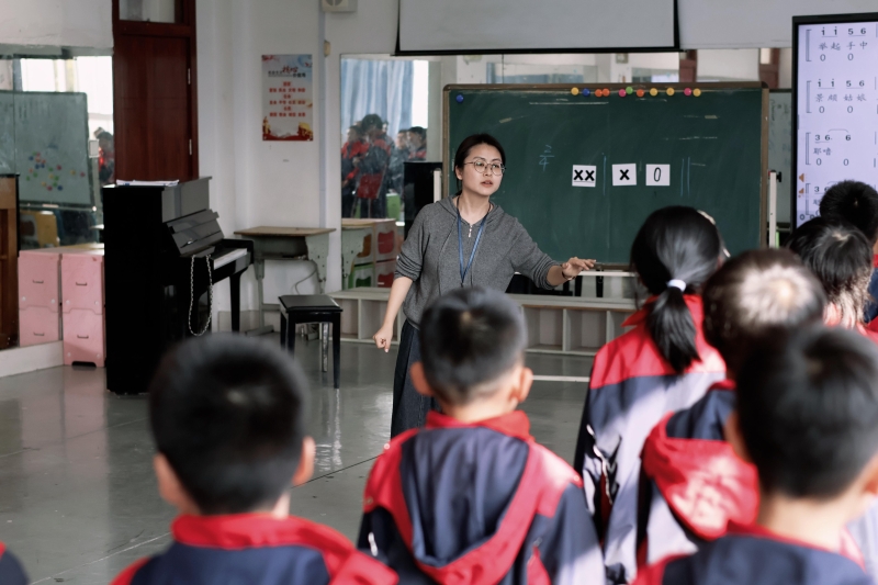 上午第一节课由鲍丹霞老师在四(1)班执教,以景颇族舂米文化为核心,将节奏律动、劳动体验与器乐演奏相融合,打造了一堂富有民族风情的音乐课。课堂开场,鲍老师以律动导入点燃学生热情,通过节奏互动自然引出“舂米”主题,让学生在轻松的氛围中建立音乐感知。新课学习环节,鲍老师深挖景颇族文化内涵,先介绍景颇族的服饰、房屋与节日,为学生搭建民族文化认知框架;随后通过师生接唱、你做我模仿等形式,引导学生模仿景颇族劳动动作并融入歌曲演唱,还以1 - 3报数为分组依据,让学生依次练习皮质类、散响类、木质等乐器演奏,逐步开展“唱+演奏”“默唱+演奏”“换乐器演唱”等实践活动,将歌唱与器乐表演有机结合,让学生在“演”与“唱”中深化对歌曲的理解。