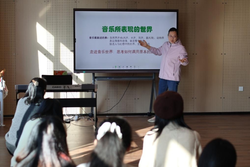 随后,正高级教师、特级教师陈晓雯的专题讲座为老师们带来了专业引领。陈老师首先强调了音乐要素教学的重要性,指出“快慢、强弱、高低、音色(断、连)、声部、结构、旋律走向”等是构建音乐感知能力的基石。她结合新课标理念,系统阐述了如何通过对比聆听、身体律动、图形谱等多样化的教学手段,引导学生敏锐地捕捉和表现这些音乐要素,从而有效提升教学质量。