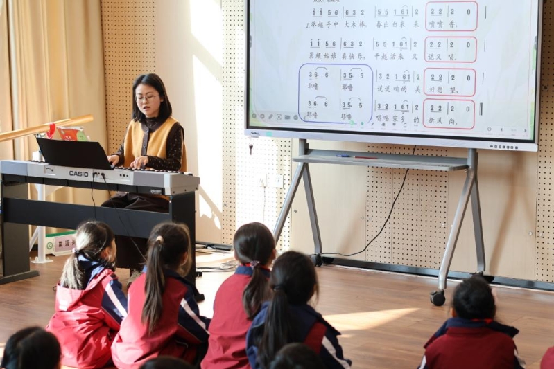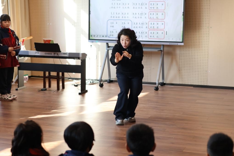 上午,谢云云老师执教《新疆是个好地方》,通过展示新疆人民采摘葡萄、放牧劳作的生动场景,巧妙地将劳动体验融入音乐学习。学生们在欢快的手鼓节奏中模仿采摘葡萄的动作,在优美的舞蹈律动中感受牧场劳动的韵律。特别值得一提的是,谢老师设计了"我是小果农"的情境游戏,让孩子们在模拟劳动的过程中自然掌握歌曲节奏,体会劳动带来的快乐与成就感。这种将地域文化、劳动体验与音乐学习有机融合的教学方式,为后续的课程研讨打开了思路。