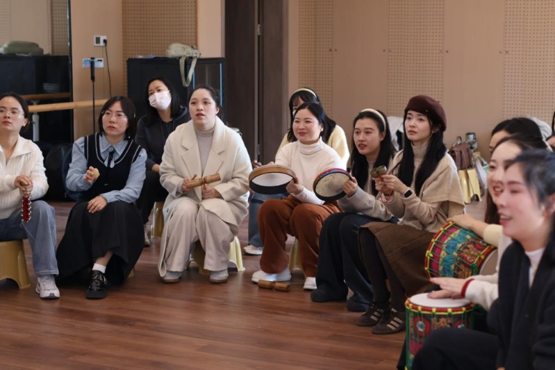 上午的压轴课程由鲍丹霞老师执教,她将重点放在《舂米歌》的劳动场景再现上。鲍老师精心准备了景颇族的劳动工具图片,通过"你做我猜"的游戏方式,让学生理解舂米、筛米等劳动动作的要领。在学唱歌曲时,她特别注重劳动节奏与音乐节奏的对应训练,引导学生用身体律动表现舂米的轻重缓急。最精彩的是器乐合奏环节,学生们分组使用沙锤、双响筒等乐器,模拟出劳动时的各种声响,仿佛真的置身于景颇族的劳动现场。